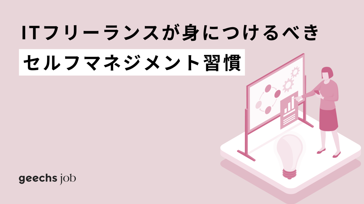 ITフリーランスの方のための『お役立ち情報』をご紹介しています。この情報のテーマはITフリーランスが身につけるべきセルフマネジメント習慣です。geechs job(ギークスジョブ)では、「フリーに生きる」ためのノウハウをご紹介し、ご希望のキャリアやライフプランを実現できるように、サポート致します!